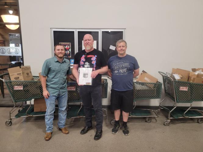 From left to right: Midwest Food Bank representative, Eureka College Professor Christopher Wille with the “Color Us Hopeful” coloring book, and Professor Zeke Jarvis.