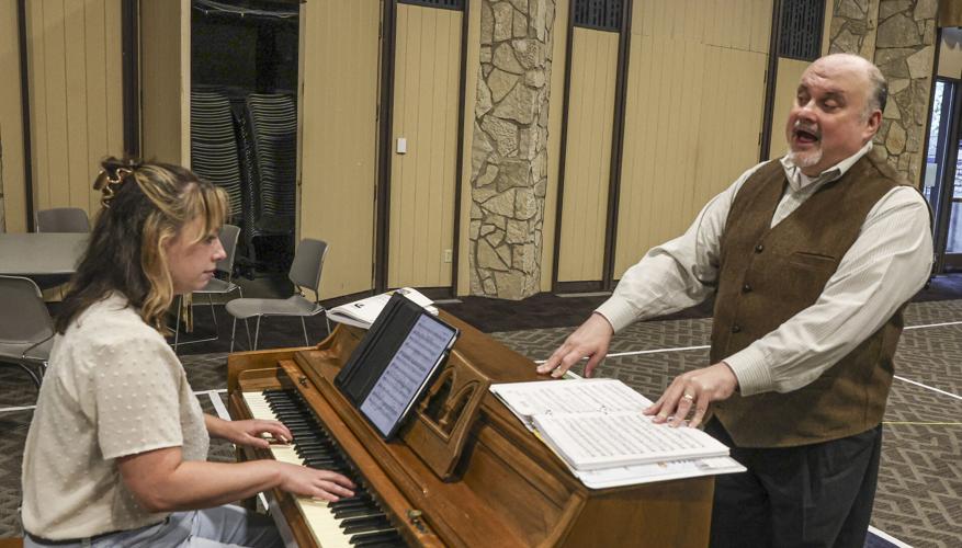 Music director Kari Kaps, left, and Pat Gaik rehearse for “The Baker’s Wife” at St. John’s Lutheran Church in Bloomington.